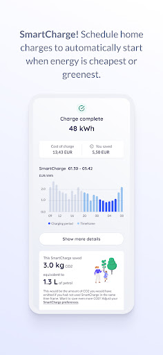 – Charge greener and cheaper: schedule charges to automatically start when electricity prices and CO2 emissions are at their lowest
