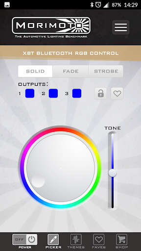 The Morimoto XBT RGB Color Control app is designed especially for use with Android devices. Inside, you’ve got control over nearly everything! The color-wheel allows you virtually infinite control over the exact hue and intensity of your RGB accessories. Adjustable Fade, Strobe, and pre-programmed color-changing themes provide a handful of special effects to spice it up. If you’ve got a few favorite combinations, you can save them to your favorites list and load ’em up again later with ease!