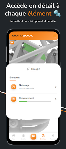 Pour chaque élément à entretenir ou à contrôler sur la moto, MotoBook t’informe du temps restant ou du nombre de kilomètres restants avant la prochaine échéance. L’application se base sur le paramétrage des intervalles d’entretien.