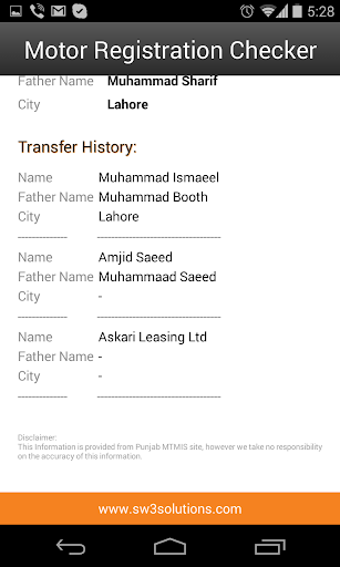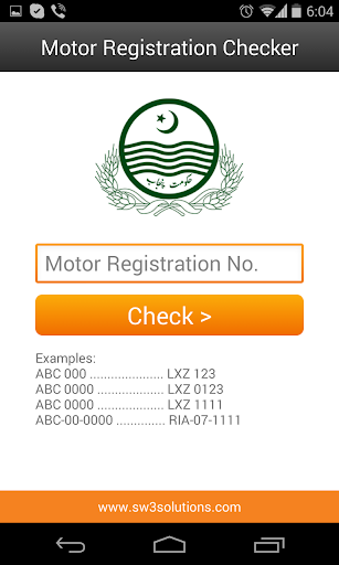 You can check the Vehicle Details, Ownership Details and the Transfer History of any Vehicle registered in Punjab, Sindh & KPK provinces, Pakistan. Just enter the vehicle registration no and the app will loop-up the details and show you the complete information about the vehicle, even the Engine and Chasis No.