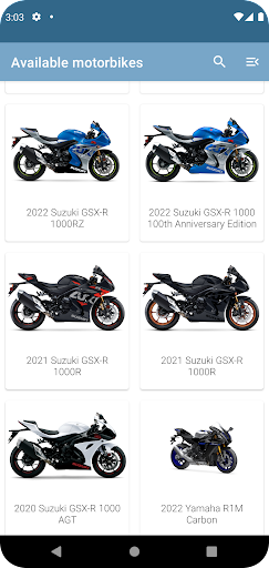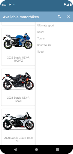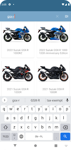 e.g. You whant to buy 2007 Suzuki GSX-R 1000 and don’t know what colors was in 2007. Download our application and check it! Now see, this motorbike fairings is from 2007, 2008, and 2009. Check if there were such colors in the entered year