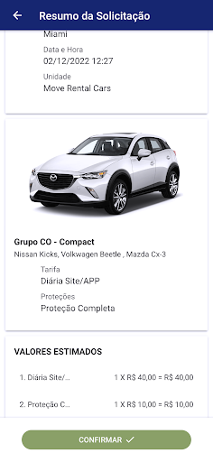 Este aplicativo faz a solicitação de reserva na Move. Na sequência sua solicitação será processada, sendo alocado um veículo para atender a reserva. Após o veículo ser reservado, o status se altera para “Confirmada” indicando que está tudo certo com a reserva.
