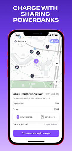 Phone or laptop ran out of charge? Find a powerbank station on the map in the app and rent it. Just scan the QR code of the station. Charge up – cables are built-in. There are Type-C, micro-USB, and Lightning for iPhone. You can return the charger to any station.