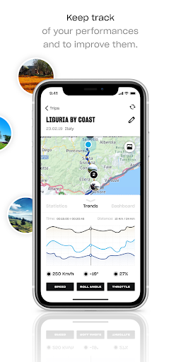 Recent trips data features speed, lean angles, gear shifts, throttle and other and other information for any moment of your trip. Pictures taken during that trip can also be added to create galleries. Always preserve a memorable experience with a wealth of technical details enriched by photographic and video contents.