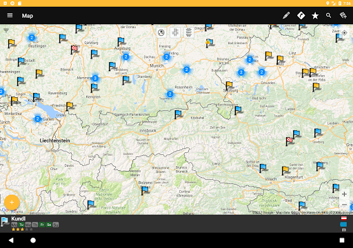 Tracks are displayed as list (order by name or distance) or displayed on a map, with additive distance to actual position.