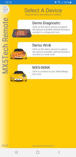 This app will allow you to securely connect via Bluetooth (BLE) to the MX5Tech Wink/Sleepy Eye mod. Activate any of the wink options remotely, access additional wink sequences and re-configure your wink mod to suit your requirements.