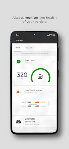 Always have updated information on your vehicle’s fuel or battery level, airbag, and odometer status in addition to tyre pressure. Receive Vehicle Health Alert notifications whenever a fault is detected.