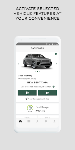 • Whether it is access to real time information about your vehicle, observing your vehicle’s past activity, or the peace of mind to check and lock your vehicle remotely, the My Bentley App provides you with access to a wide range of driver enhancing services.