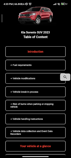 kia Sorento User Manual, If you are an owner of an kia Sorento, this app will help you a lot in your day-to-day use No need to go through a traditional paper book, handbook Glance through this digital version of kia Sorento to resolve your issues and all the how-to’s, and nitty-gritty When and which oil to use and a lot more Download and refer to it as many times you want without the risk of losing it