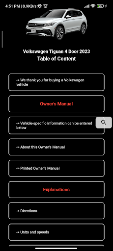 VW Tiguan User Manual, If you are an owner of an VW Tiguan, this app will help you a lot in your day-to-day use No need to go through a traditional paper book, handbook Glance through this digital version of VW Tiguan to resolve your issues and all the how-to’s, and nitty-gritty When and which oil to use and a lot more Download and refer to it as many times you want without the risk of losing it
