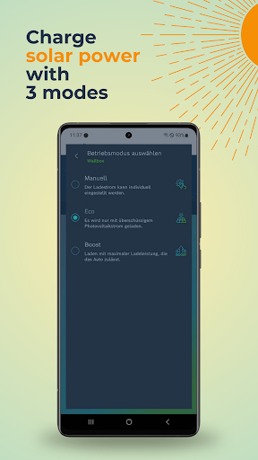 • PV surplus charging: Charge your car with solar power in three modes (PowerMeter 63 required) – Manual (charging power adjustable in the app), Boost (preset maximum charging power of the wallbox) or Eco (PV power only). The modes are available for the entire Amperfied Wallbox connect series. The connect.solar even charges from 1.4 kW PV surplus (all other wallboxes from 4.1 kW).