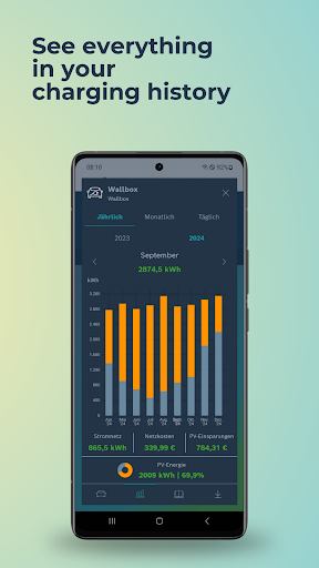 • Charging and consumption analysis: Track your charging history, solar power and grid consumption as well as costs and savings. Download the data as a CSV file and receive cost estimates.