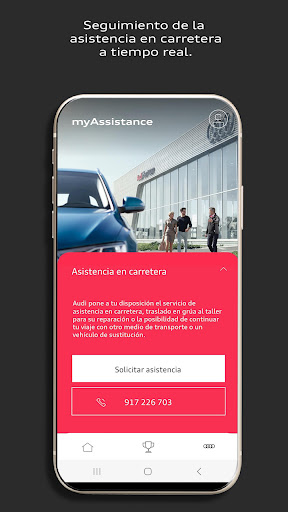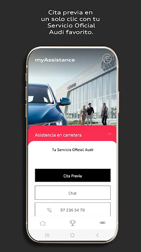 myAssistance: ponemos a tu disposición la posibilidad de reservar cita previa en tu Servicio Oficial Audi y podrás contactar a través del chat de la app con nuestros especialistas cuando quieras. También podrás solicitar Asistencia en Carretera cuando lo necesites y hacer un seguimiento de la grúa en tiempo real.