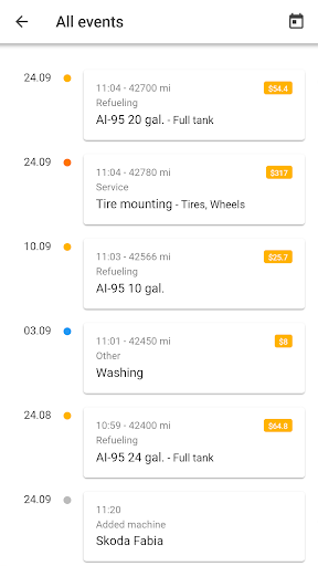 ● Handy process of keeping record of the events and costs of your car (fuelling, oil change, repairing, washings, auto customizing and so on).