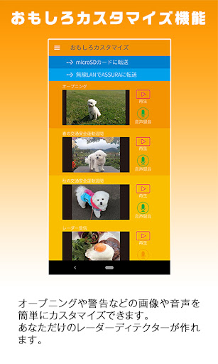 ASSURAのオープニングや警告、案内の画像や音声をスマートフォンを使って、カンタンにカスタマイズすることができます。画像はスマートフォンのカメラ機能を使って撮影、またはフォトギャラリーの画像を登録します。音声はスマートフォンのマイク機能を使って録音し登録します。
