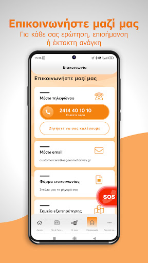 • Δίνει τη δυνατότητα άμεσης επικοινωνίας με την εξυπηρέτηση πελατών του Αυτοκινητόδρομου Αιγαίου, με διάφορους τρόπους (τηλεφωνικά, μέσω email, μέσω φόρμας επικοινωνίας, αυτοπροσώπως με οδηγίες πλοήγησης προς τα ΣΕΠ)
