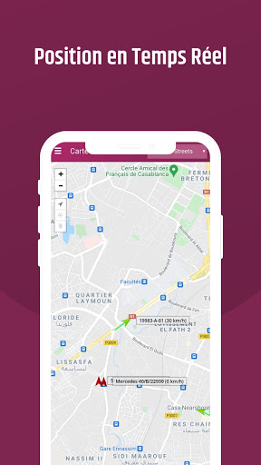 Localisation des véhicules en temps réel, Accès à l’historique des véhicules : Position sur Map, Vitesse, temps d’arrêt.