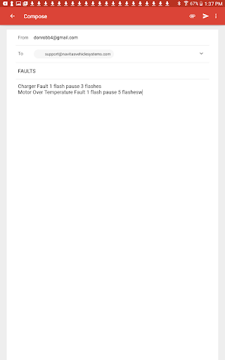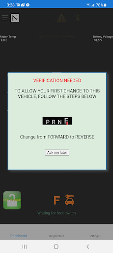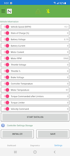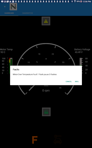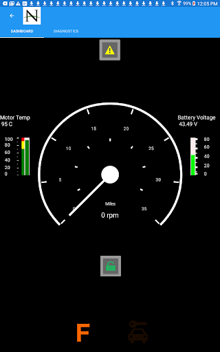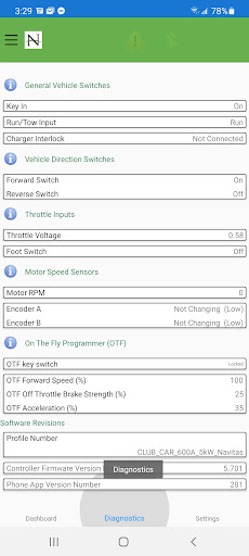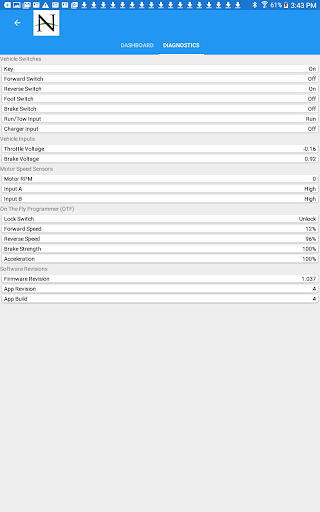 This application allows a connection to several vehicles made by Navitas Vehicle Systems. When connection is made a dashboard shows with a speedometer, some I/O and several gauges. A user may then switch to a diagnositcs tab to view the current state of vehicle I/O