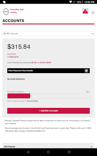 The Nissan Canada Finance (NCF) Finance Account Manager app allows an existing NCF customer to manage their account on-the-go.