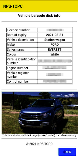 Vehicle license disk barcode information is displayed on this app see https://www.transport.gov.za/register-motor-vehicle on who should register a vehicle and receive a vehicle license disk.