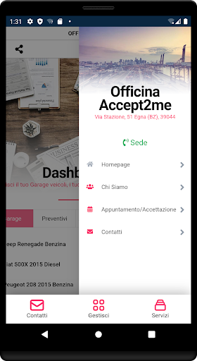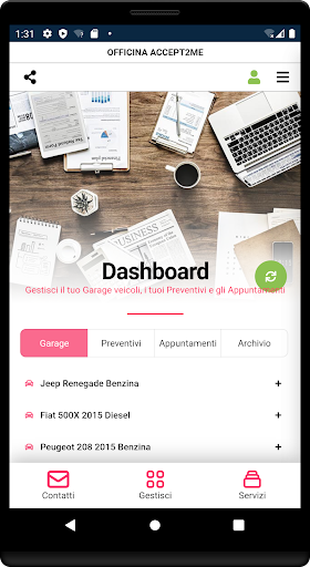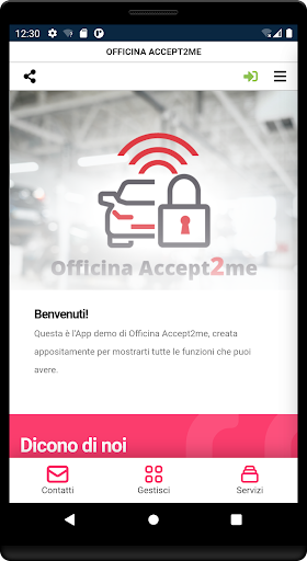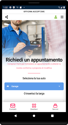 Grazie all’app di officina Accept2me puoi effettuare la pre-accettazione da remoto, gestendo i tuoi veicoli con riconoscimento targa, selezione del servizio, monitoraggio degli interventi, gestione degli appuntamenti e molto altro.