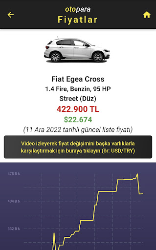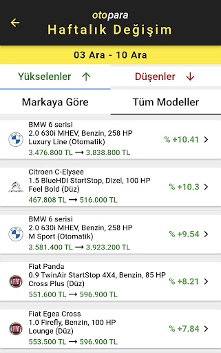 seçin. Aracın ufak bir görüntüsünü, veritabanında bulunan güncel liste fiyatını, güncel Amerikan Doları USD üzerinden liste fiyatının kaç dolara denk geldiğini ve her hafta TL liste fiyatının nasıl değiştiğini inceleyin.