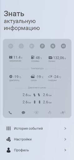 – Monitoring the current state of your car: statuses of all security zones and sensors, current fuel level (it depends on connections), engine temperature, car interior temperature, outside temperature (additional sensor is required), current car location (for systems with a GPS/GLONASS-receiver).