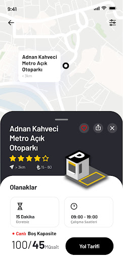 Parkera, İstanbul’da bulunan 100’den fazla otoparkla birlikte çalışarak en uygun park yerini bulmanızı sağlayan bir mobil uygulamadır. Size en yakın boş otoparkları tek tuşla bulabilirsiniz. Otoparkların gerçek zamanlı boş park yeri sayısı, açık adresleri, saatlik ve günlük ücret tarifeleri ve çalışma saatleri gibi bilgileri görüntüleyebilirsiniz. Ayrıca en ucuz otoparkları belirleyebilirsiniz.. Parkera, Apple Haritalar, Google Haritalar, Yandex Haritalar ve diğer navigasyon/harita uygulaması ile entegre çalışır ve kullanmakta olduğunuz uygulamalara yönlendirme yapar. Parkera mobil uygulamasını indirerek, ucuz, açık ve size en yakın otoparkları bulabilirsiniz. İyi yolculuklar!