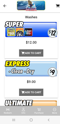 Patriot Car Wash is the new, easy-to-use app that provides you with access to the area’s finest car washes. Use our mobile app to create your own secure account to purchase individual washes, gift cards and to join subscription based wash clubs. You can add a credit card to your mobile app and make future purchases with just a card on file without having to open your wallet again. At the car wash, you can redeem your purchased wash remotely without rolling down your window to touch the screen. Simply enter your wash code or scan the barcode displayed in the app. You may also view a visual history of your purchases including date, time, service purchased, and remaining washes if a wash book is purchased. Patriot combines convenience and technology to keep your vehicle sparkling!