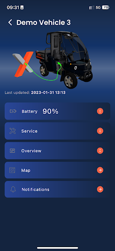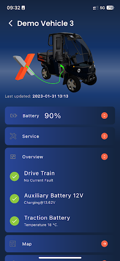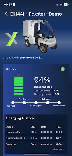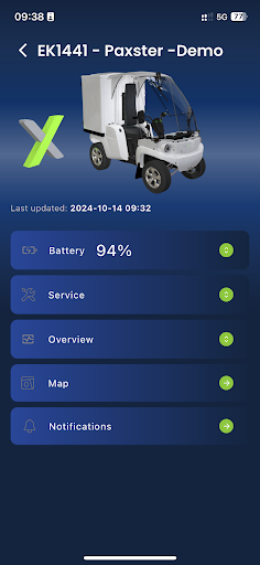 User App for control and feedback from the Paxster vehicle, Charge notifications, events, and localization functions. The app is also for fleet administrators and managers that want an overview of their Paxster fleet.