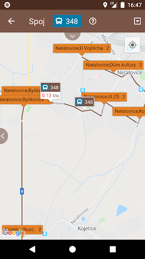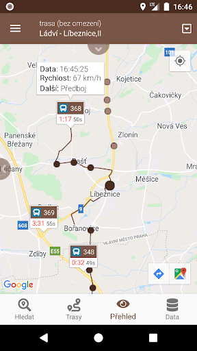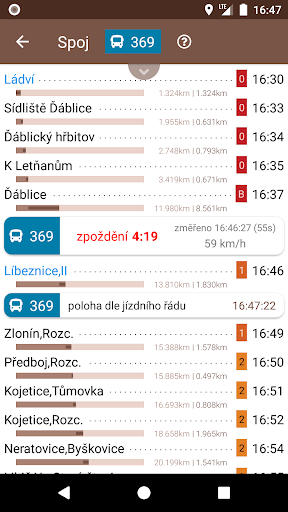 – zobrazení detailu spoje (jak seznam zastávek, tak nad mapou)
