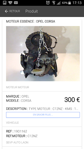 En tapant sur un produit dans la liste, l’application vous affiche le détail de la fiche produit en précisant, si besoin, la génération et la version du modèle, les images de la pièce.