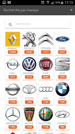 Marque : le nombre sous le logo de la marque vous indique le nombre de pièces en stock pour cette marque de voiture.