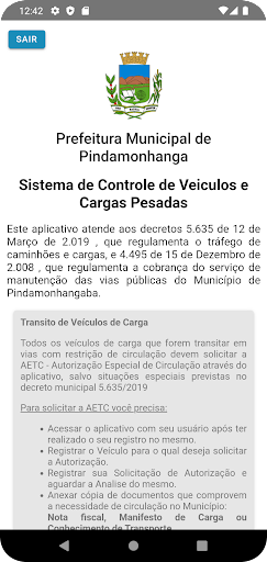 Este sistema atende o decreto 5635 de 12 de março de 2019 , que regulamenta o tráfego de caminhões e cargas no município de Pindamonhangaba. Nesse sistema é possível o cadastro de usuários (motorista/responsável), veículos e gerenciamento das autorizações. Todos os veículos de carga que forem transitar no município ficam obrigados a solicitar autorização de circulação através desse sistema, salvo situações especiais previstas no decreto disponibilizado acima.