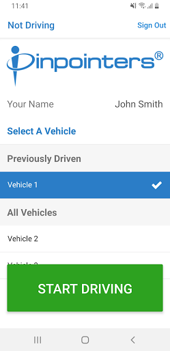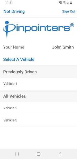 The Pinpointers Driver ID App allows a driver to declare which vehicle they are currently driving. The driver can quickly choose from a recently driven vehicle or from the full fleet list.