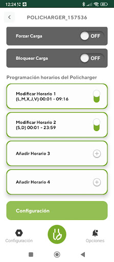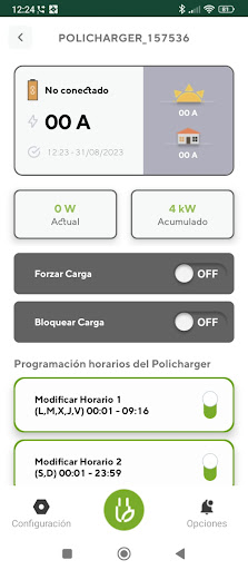🔌 Cargas Programables en Tiempo Real: Define hasta 4 horarios diferentes para cargar tu vehículo eléctrico los 7 días de la semana. Olvídate de preocuparte por la carga; Policharger se encargará de todo automáticamente.