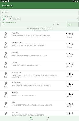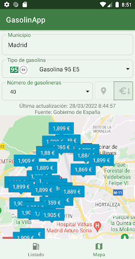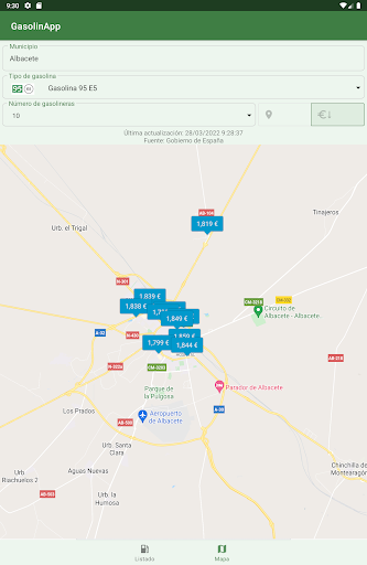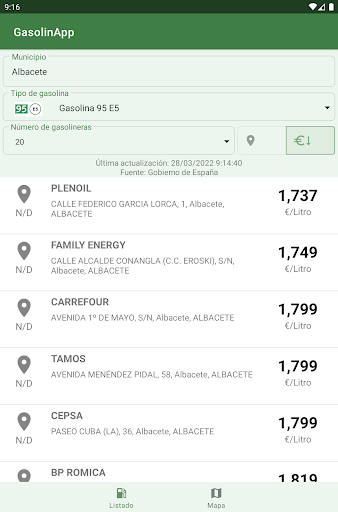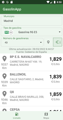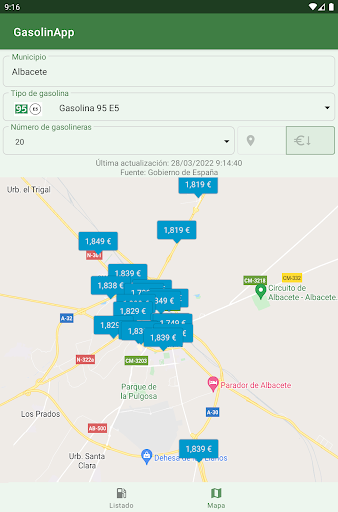 GasolinApp te permite encontrar las gasolineras con los mejores precios en todo tipo de combustibles: Gasolina 95, Gasolina 98, Diesel, Diesel Premium, Gasóleo B, Gasóleo C, Biodiesel, Bioetanol, GLP, etc. Además encuentra rápidamente el litro más barato de entre todas las gasolineras cercanas más económicas, activando los permisos de ubicación de tu dispositivo.