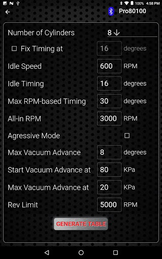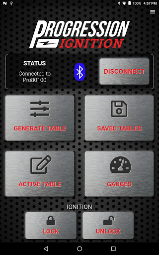 All New tuning app for use with Progression Ignition distributors. New features include- all new graphics, GPS Speedometer and gauge dials, manifold pressure gauge with in/hg and psi, faster Bluetooth connecting, and cloud backup. Uses Bluetooth to connect to the distributor. Create a timing table by entering a few simple parameters. Change ignition timing advance, Rev limiter, RPM and MAP breakpoints using table editor. Make changes instantly with the engine running or not. Save as many different tables as you want and load them instantly. Gauges screen shows you real time data. The theft prevention feature Ignition Lock allows you to prevent the engine from starting when parked.