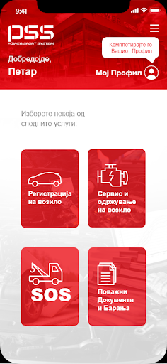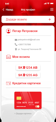 Во делот на мој профил корисникот има можност да ги едитира своите податоци, да ги додаде сите свои возила, како и кредитни картички со кои ќе може да врши плаќање на сите услуги што ги нуди ПСС преку оваа апликација.