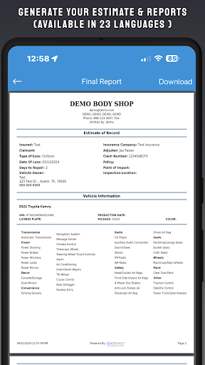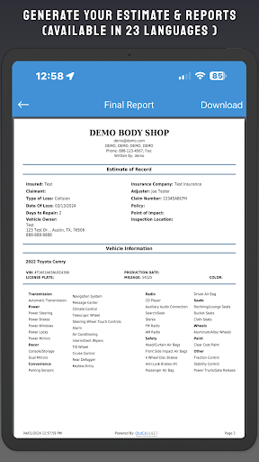 Quicksheet is the new app with collision estimating software available on your Android mobile device. You can write estimates, appraisal reports, attach photos, even complete your invoicing all within the app. The app creates professional PDF estimates using typical part prices and labor for each vehicle with and integrated refinish formula for clear coat and 3-stage paints. The reports can be printed from any Wi-Fi printer, emailed or sent via text message and are backed up online for quick and easy reference later from a desktop computer or other device. Quicksheet is also available on your desktop computer at quicksheetapp.com which you will have full access to with your app credentials. The software can be changed to 23 different languages including Spanish, French, German and Russian and over 100 different currencies from around the world. No more expensive estimating software, and no more getting trapped in never ending contracts. In short, Quicksheet is collision estimating, simplified.