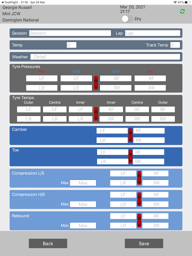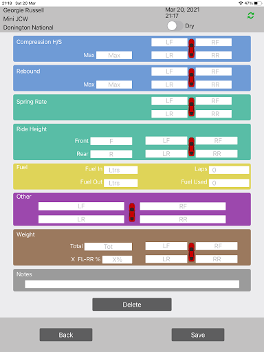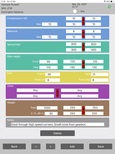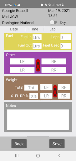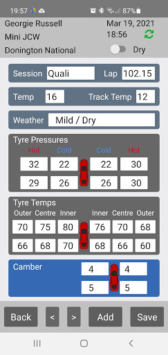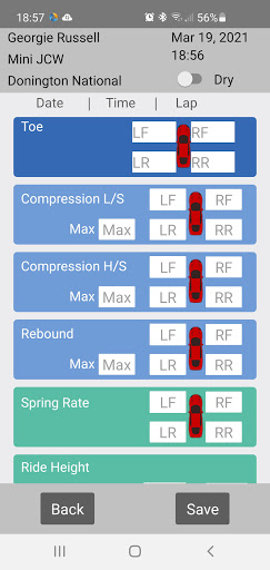 Race Car Setup Log stores your race car settings on your phone so all your previous setups and changes from every circuit are at hand where ever you are.