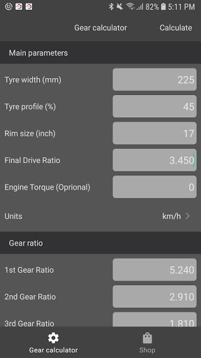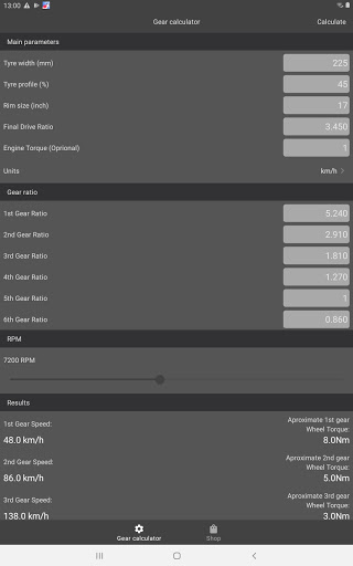 This application provides accurate top speed calculations based on your transmission ratios and differential gear ratio. It gives you information about maximal speed by each gear.