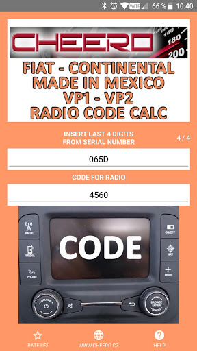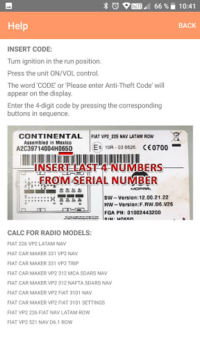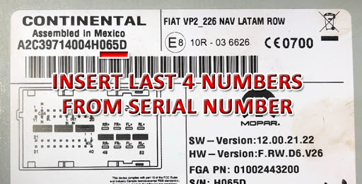 Calc CODE for radios FIAT TORO VULCANO FREEDOM – JEEP RENEGADE – model CONTINENTAL VP1 or VP2 – Made in Mexico.