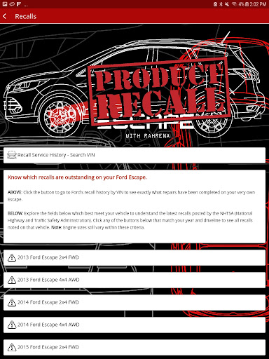 – Safety recall lookups for all existing recalls for your model, or your specific vehicle