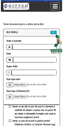 Dupa introducerea numarului de telefon, a adresei de e-mail si incarcarea celor doua poze, un consultant Ritter Broker se va ocupa de gasirea celei mai bune oferte pentru asigurarea dumneavoastra.