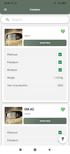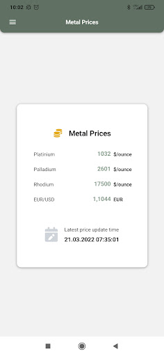 App provides calculating price and displaying list of catalysts based on current price of precious metals.