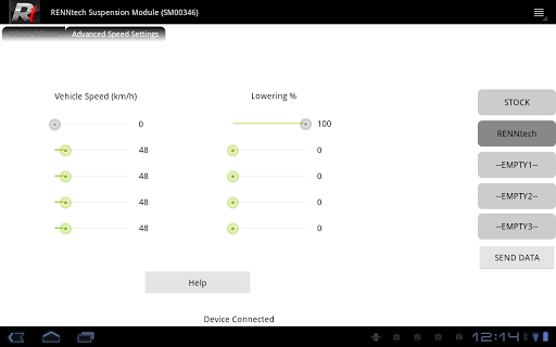 An application used to control the RENNtech V3 Digital Lowering Module (DLM) or the RENNtech Hand-held Suspension Module (HSM). This application will allow you to change the ride-height of your RENNtech DLM-equipped vehicle on-the-fly. Save and quickly load your three favorite ride settings for a special look or to get up that pesky sloped driveway. Application requires a USB host connection to the RENNtech DLM or HSM.