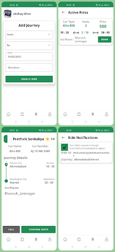 2. **Trip Creation**: Users can create a new trip by specifying their start and end points, departure time, and the number of available seats. They can also add multiple waypoints to the trip, such as on a trip from Ahmedabad to Vadodara through Nadiad and Anand.