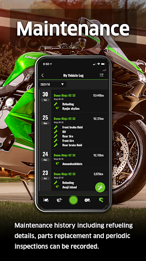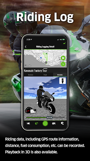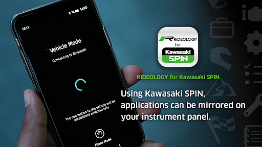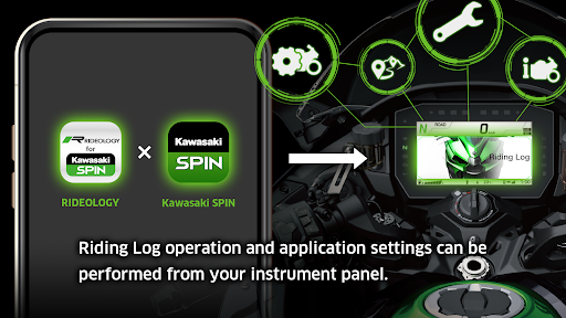 Working with Kawasaki SPIN, the app allows RIDEOLOGY THE APP MOTORCYCLE functions to be enjoyed. From your vehicle, you can record riding logs, and change app settings.