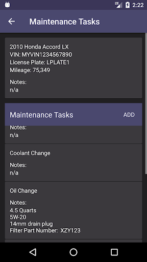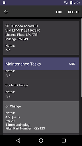 Several common tasks are automatically made available when a new vehicle is added, but these can always be edited. Notes can also be stored for each vehicle, as well as for each individual maintenance task, for and each individual maintenance record.